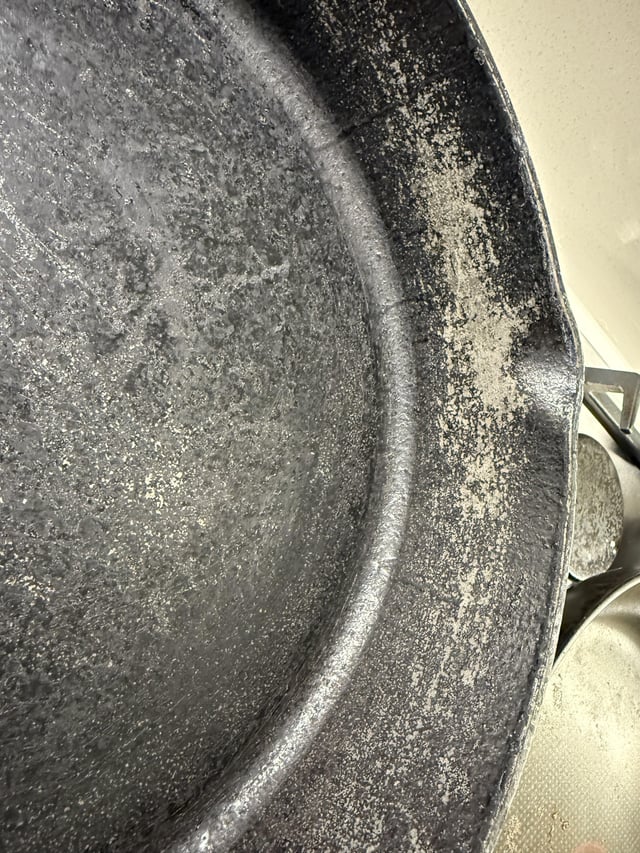 If the seasoning looks dull, sticky, or chipped, the skillet needs reseasoning. Good seasoning should be shiny and even.