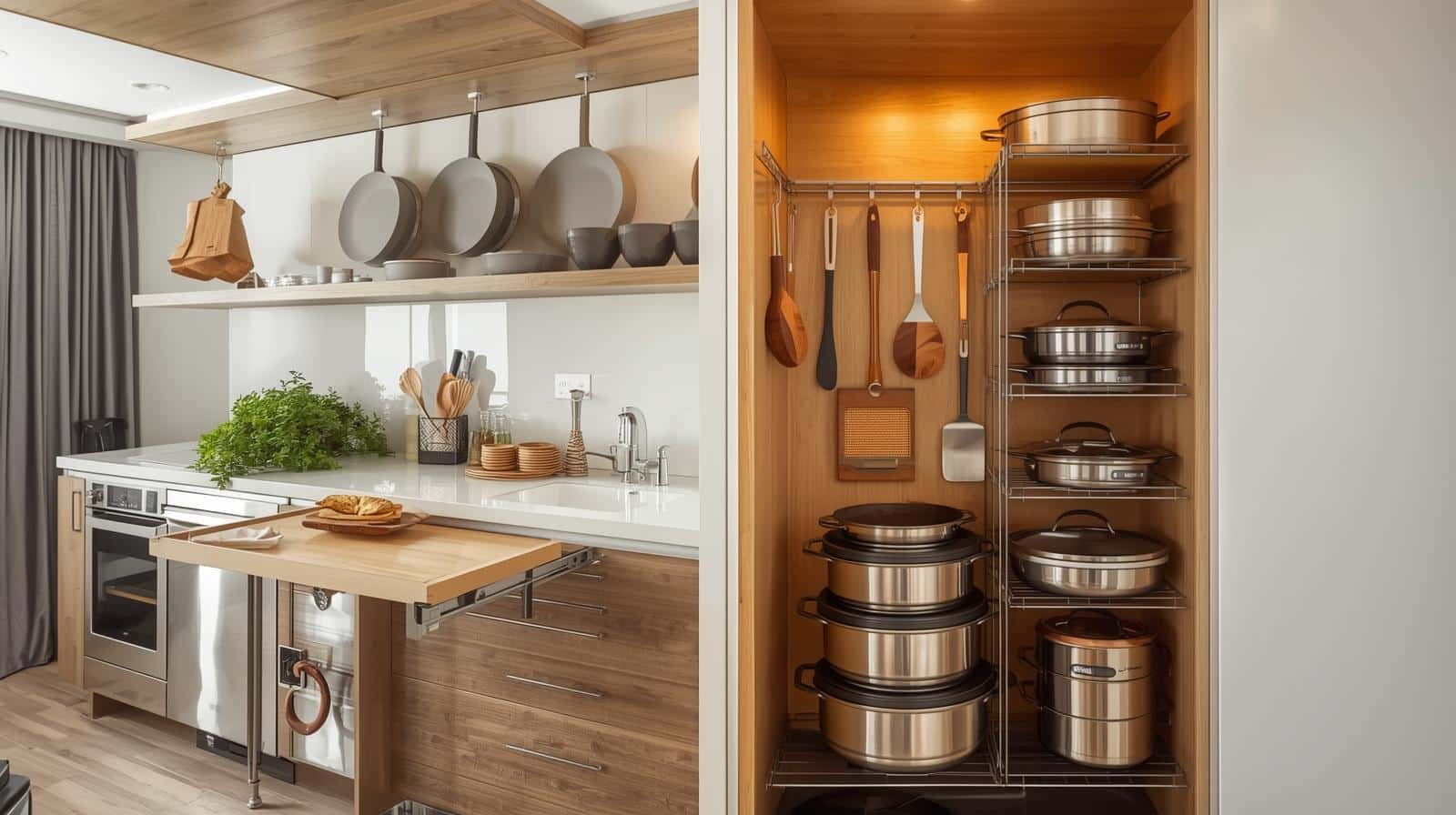 Small kitchens need smart ways to store pots and pans. Maximizing cabinet space helps keep your kitchen tidy.