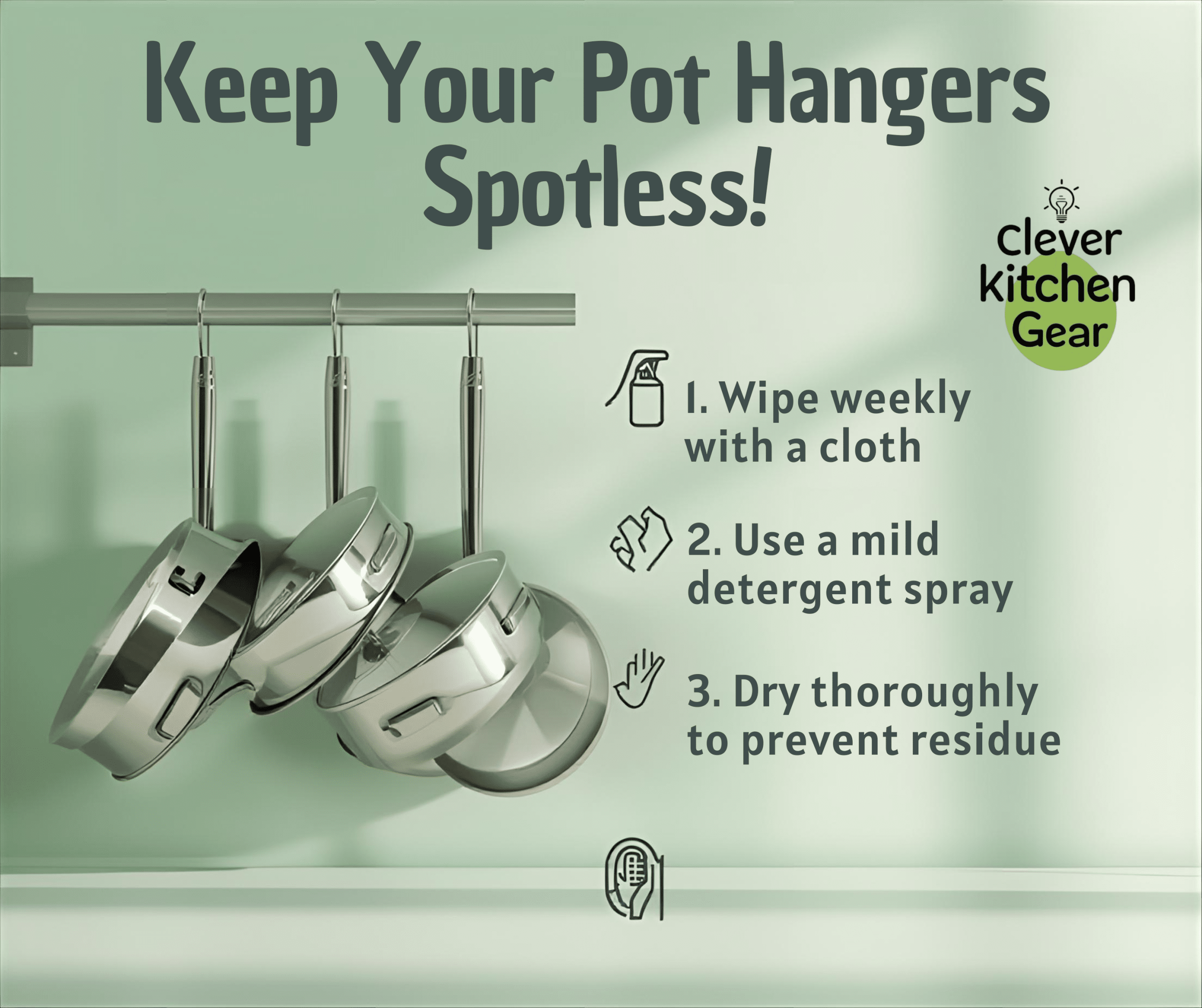 Clean the pot hangers and nearby surfaces often. Use a soft cloth with mild soap and warm water. Wipe down the hangers carefully to remove grease and dust.